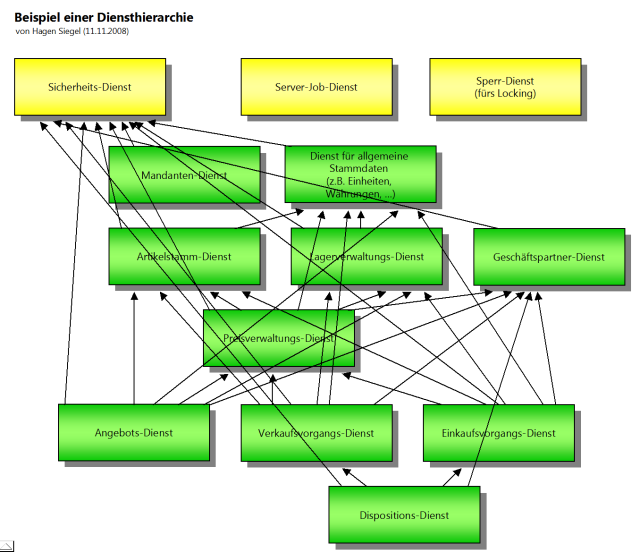 Das Bild zeigt beispielhaft, wie man Geschäftsdienste einer verteilten Business Software in eine "gedachte" Hierarchie bringen kann, um damit die Abhängigkeiten zu reduzieren.